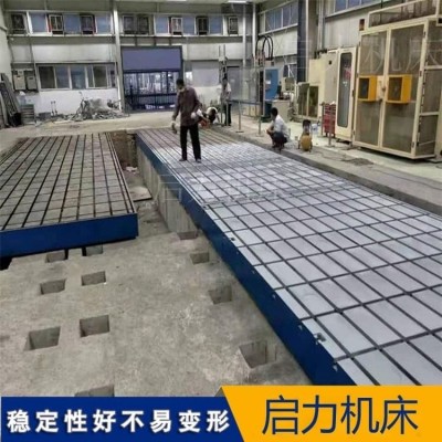 精度保障结构设计是试验铁地板适配电机测试的关键,直接影响电机安装与测试精度。台面经粗磨、精磨、超精磨三道工序加工,平面度误差≤0.05mm/m(0级精度),表面粗糙度Ra≤1.6μm,电机底座与台面贴合面积≥95%,避免因接触面间隙导致的定点偏差;台面预留标准化T型槽(槽宽16/22/28mm,间距50/100mm,公差H11)与定点销孔(H7级公差),确保电机底座、夹具与试验铁地板对接,定点精度≤±0.03mm。同时,底部设置可调地脚螺栓(M30×350mm10.9级强度螺栓),搭配00级合像水平仪校准,台面水平度可控制在0.03mm/m以内,避免电机倾斜导致的受力不均,保障转速、扭矩等测试数据的真实性。