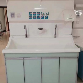 高分子洗手池材质特点:采用高分子材料一次吸塑成型,出水方式有:感应式、膝控式、脚踏式和手动开关,一台洗手池可客户要求选择单一出水方式或多种出水方式。洗手池分高背和低背,高背总高度1800mm,配有美容镜,照明灯,皂液器,可按客户要求配置烘手器和热水器。低背板无配置。